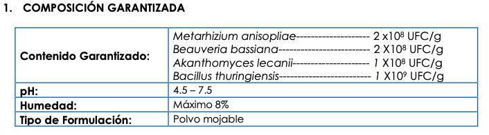 Beauveria bassiana, Metarhizium anisopliae, Akanthomyces lecanii y Bacillus thuringiensis.